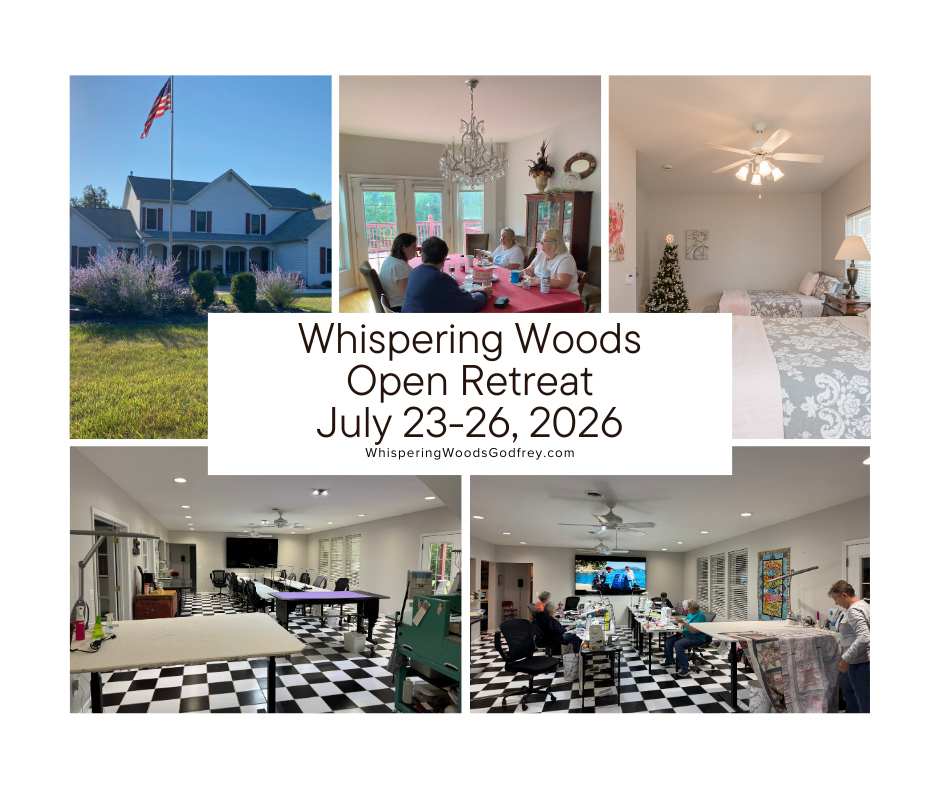 Designed for those who enjoy quilting, sewing, photography, needle point, knitting, crocheting, jewelry making and more! Nestled in the heart of rural Godfrey Illinois, Whispering Woods B&B/Retreat Center is a luxurious, peaceful home for you to enjoy. Large rooms, beautiful common areas, luxurious bedrooms, spa like bathrooms and serenity galore… all yours to enjoy.